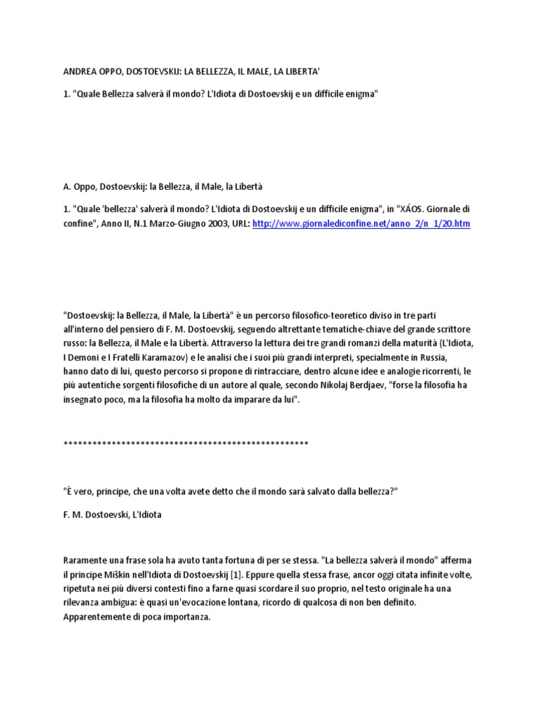 Cose la bellezza e che ruolo ha nelle nostre vite. Eppure quella stessa frase ancor oggi citata infinite volte ripetuta nei piu diversi contesti fino a farne quasi scordare il suo proprio nel testo originale ha una rilevanza ambigua. Il principe miskin nellidiota di dostoevskij affermala bellezza salvera il mondo.